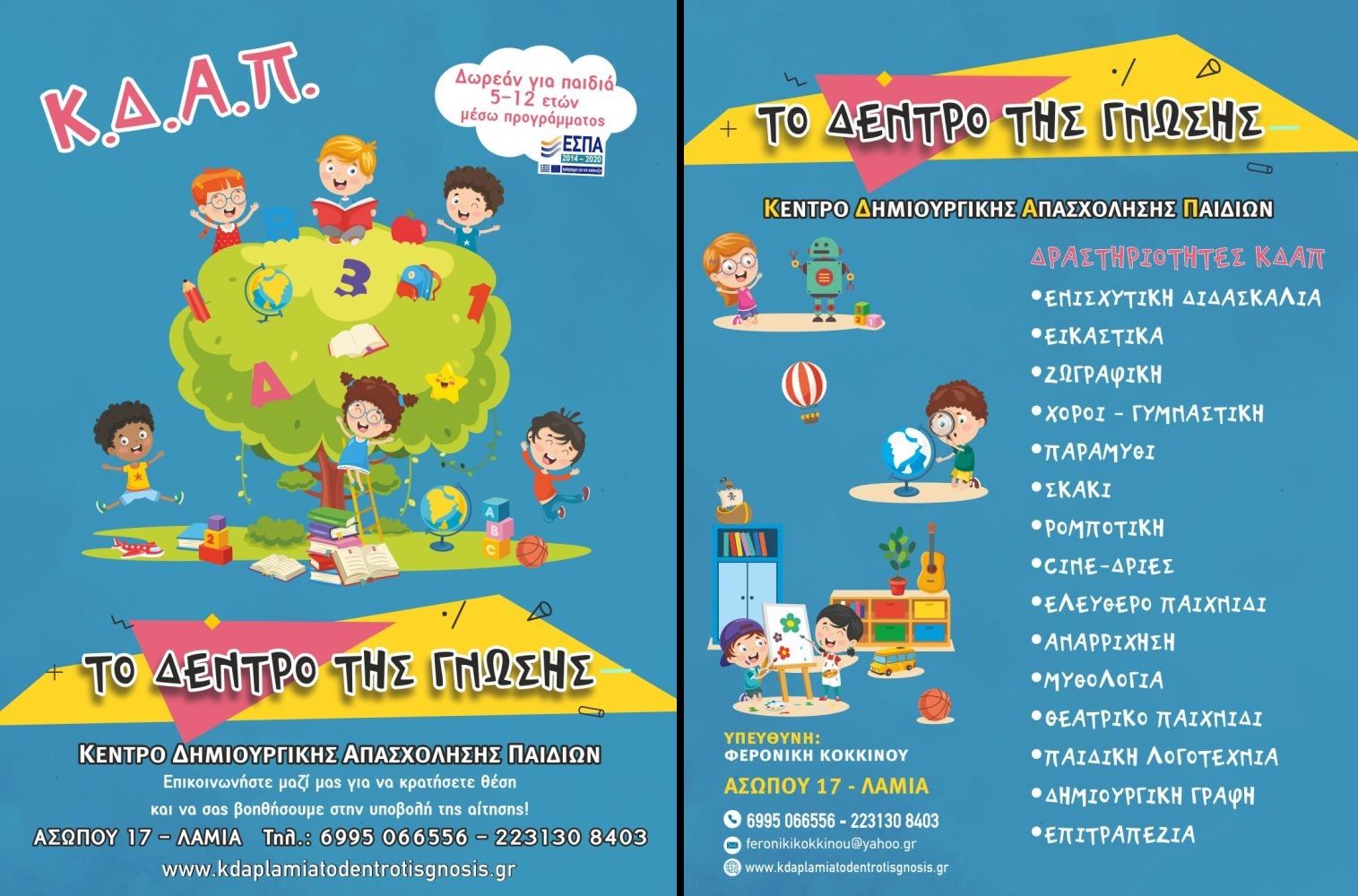 Το ΚΔΑΠ «Το δέντρο της γνώσης», Ασωπού 17 στη Λαμία, είναι έτοιμο να υποδεχθεί και φέτος όλους τους μικρούς μας φίλους, διαθέτοντας αμέτρητες δραστηριότητες!!!