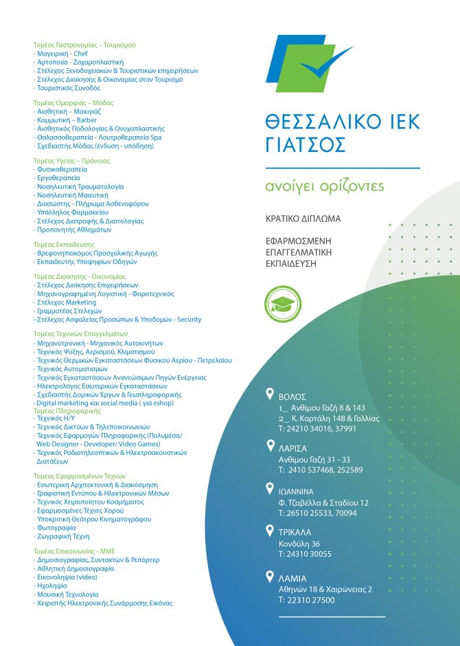 Για την νέα εκπαιδευτική χρονιά 2022 – 2023 το Θεσσαλικό ΙΕΚ Γιάτσος στη Λαμία ανακοινώνει ότι θα λειτουργήσει μεταξύ των άλλων και τις εξής ειδικότητες: