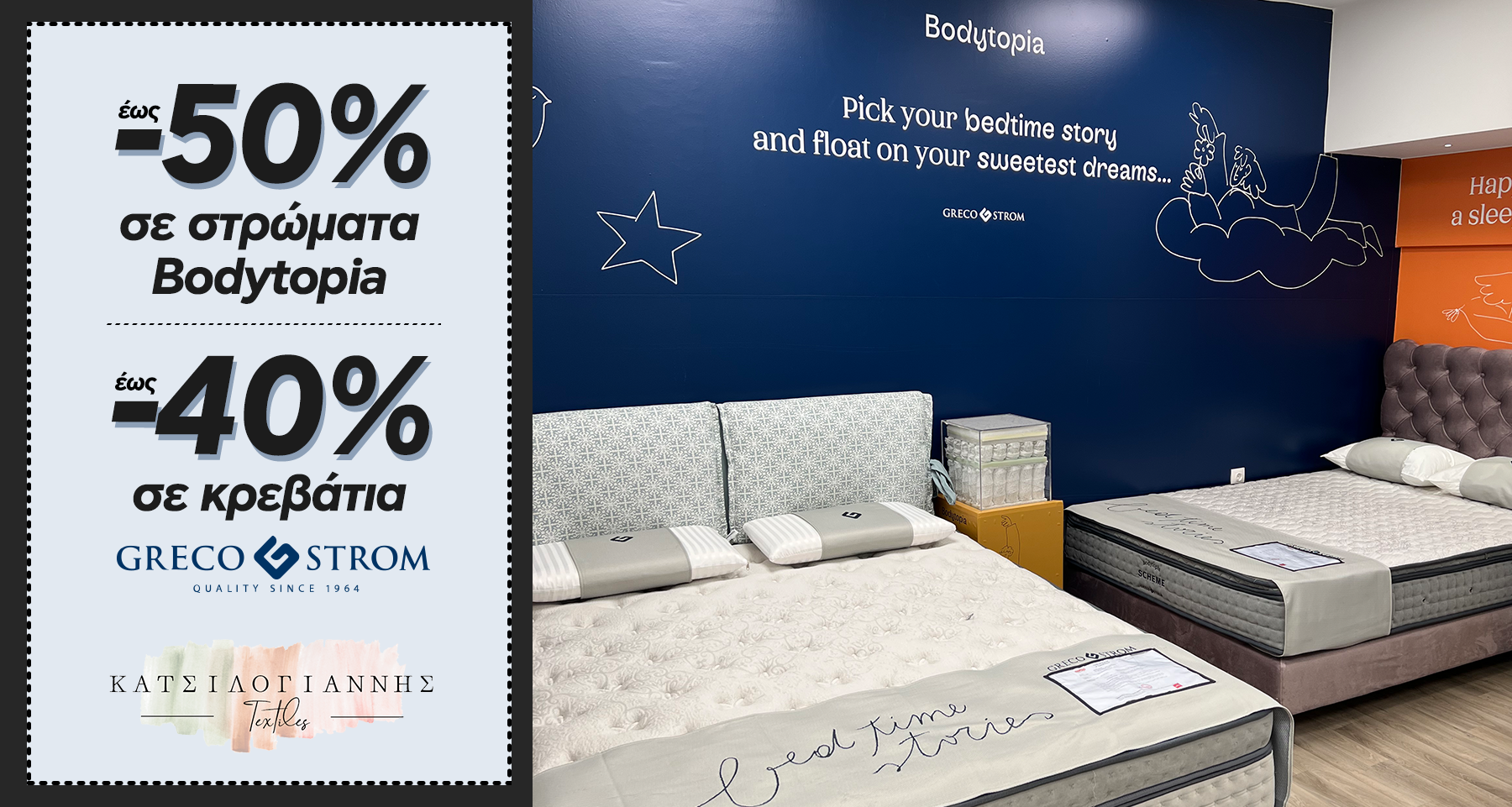 #BlackΝovember με εκπτώσεις, έως και 50%, σε όλα τα στρώματα της σειράς Bodytopia και σε όλα τα κρεβάτια Grecostrom μέχρι και τις 30 Νοεμβρίου.