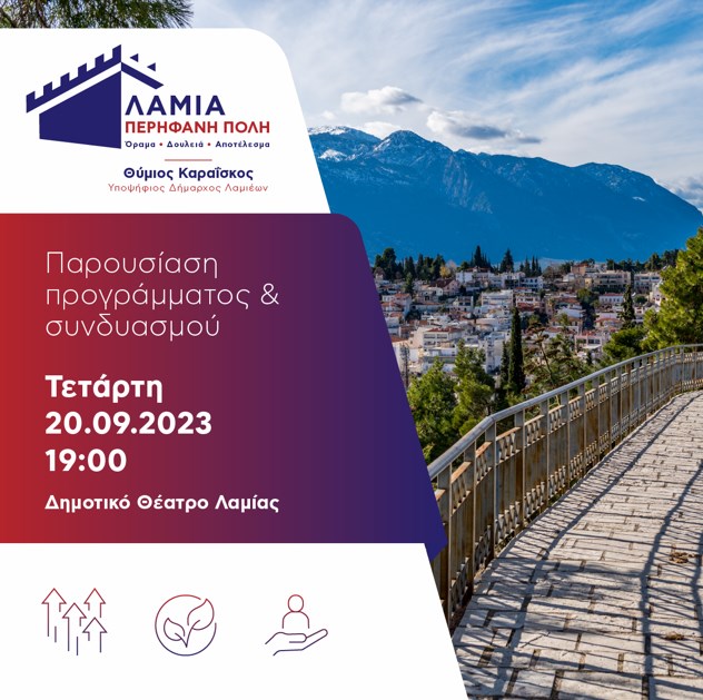 Σας ενημερώνουμε, ότι την Τετάρτη 20 Σεπτεμβρίου και ώρα 19.00 θα πραγματοποιηθεί στο Δημοτικό Θέατρο Λαμίας η παρουσίαση του προγράμματος και του Συνδυασμού «Λαμία Περήφανη Πόλη».