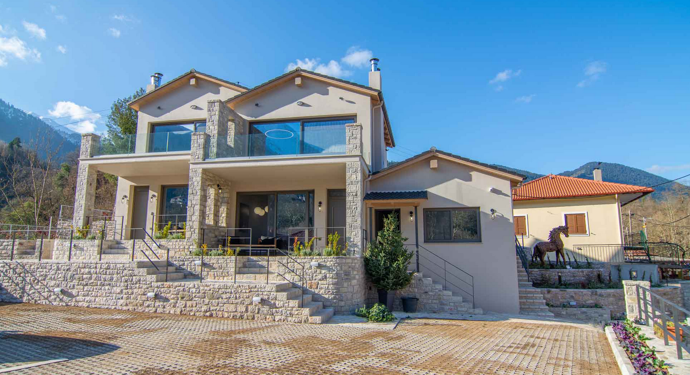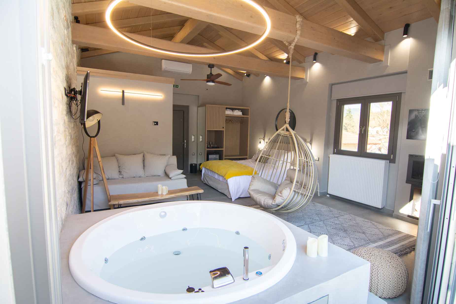 Με θέα όλο το γραφικό Μεγάλο Χωριό, ετοιμαστείτε για μοναδικές στιγμές χαλάρωσης, σε μία απ' τις τέσσερις σουίτες με υπέρδιπλο κρεβάτι, τζάκι και υδρομασάζ.