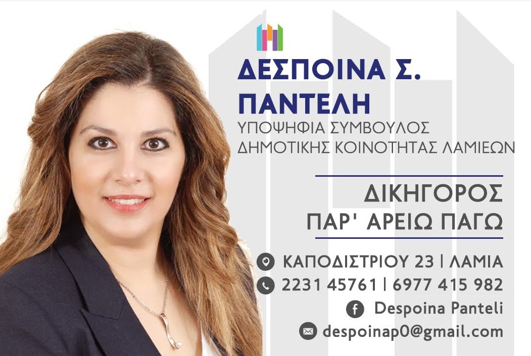 Μάχιμη δικηγόρος παρ’ Αρείω Πάγω, γνωστή στην τοπική μας κοινωνία για τη συνέπεια, τον επαγγελματισμό, τις γνώσεις και το ήθος της, ηΔέσποιναΠαντελή, είναι αναμφισβήτητα μια υποψηφιότητα με δυναμική στο ψηφοδέλτιο τηςΔημοτικής Κοινότητας Λαμίαςτου συνδυασμού «Δύναμη Ανάπτυξης για την Λαμία» τουΠανουργιάΠαπαϊωάννου.