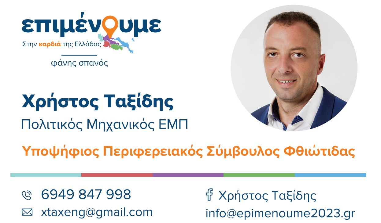 Συγκροτημένος, εργατικός, δραστήριος και βαθύς γνώστης των προβλημάτων αλλά και των συγκριτικών πλεονεκτημάτων της Φθιώτιδας, ο Πολιτικός Μηχανικός και διακεκριμένο στέλεχος της Αναπτυξιακής-Διαχειριστικής Στερεάς Ελλάδος (ΑΝ.ΔΙΑ),Χρήστος Ταξίδης,γιος του γνωστού οφθαλμίατρουΚώστα Ταξίδηκαι της οδοντιάτρουΖωής Γραβάνη – Ταξίδη, όργωσε τις τελευταίες ημέρες κάθε άκρη του νομού και διεκδικεί με αξιώσεις την εκλογή του στο Περιφερειακό Συμβούλιο με το συνδυασμό «Επιμένουμεστην Καρδιά της Ελλάδας» τουΦάνη Σπανού.