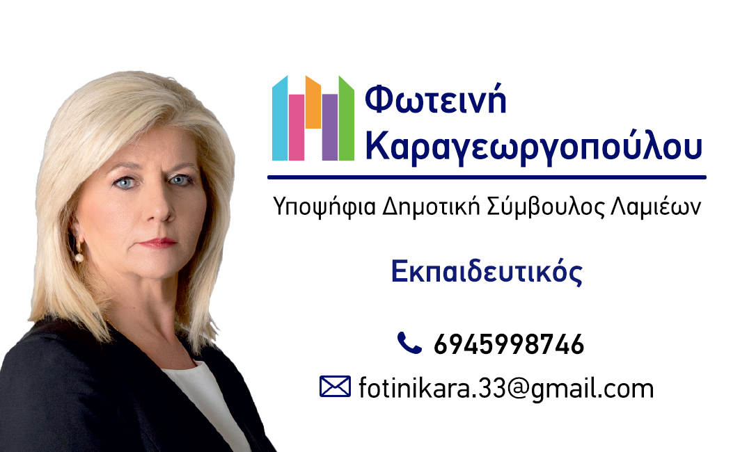 Η Φωτεινή Καραγεωργοπούλου είναι υποψήφια δημοτική σύμβουλος με το συνδυασμό "ΔΥΝΑΜΗ ΑΝΑΠΤΥΞΗΣ για τη ΛΑΜΙΑ" και διεκδικεί με αξιώσεις την ψήφο των συμπολιτών της και μία θέση στο Δημοτικό Συμβούλιο.