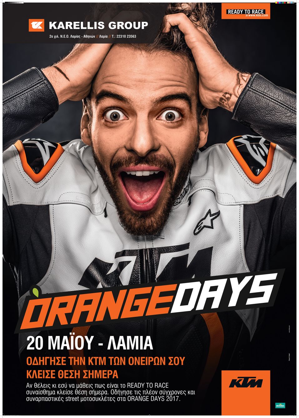 Τα ORANGE DAYS αποτελούν μια θαυμάσια ευκαιρία, για όσους το επιθυμούν, να ανακαλύψουν την ολοκαίνουρια γκάμα μοντέλων της εταιρίας, να γευτούν τις γνήσιες μοτοσυκλετιστικές αξίες που πρεσβεύει η ΚΤΜ, και να απολαύσουν μια δοκιμαστική διαδρομή με την αγαπημένη τους μοτοσυκλέτα.