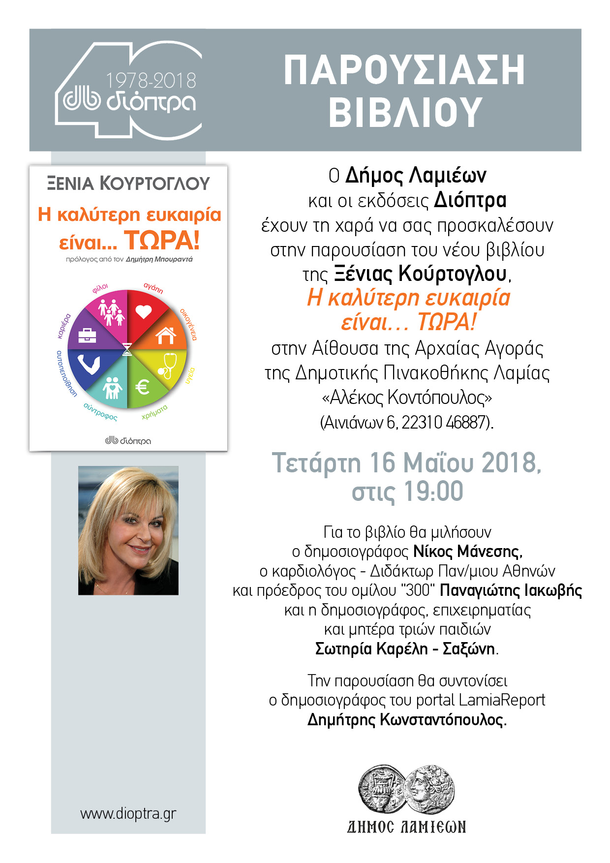 Ο Δήμος Λαμιέων και οι Εκδόσεις Διόπτρα σας προσκαλούν στην παρουσίαση του βιβλίου της Ξένιας Κούρτογλου «Η καλύτερη ευκαιρία είναι ΤΩΡΑ!» που θα πραγματοποιηθεί την Τετάρτη 16 Μαΐου και ώρα 19.00 στην αίθουσα της Αρχαίας Αγοράς της Δημοτικής Πινακοθήκης Λαμίας «Αλέκος Κοντόπουλος», στην οδό Αινιάνων 6.