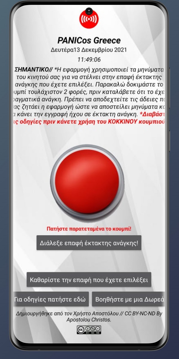 Η εφαρμογή PANICosGR αποτελεί έναν «συναγερμό» που επιτρέπει σε ένα άτομο υπό πίεση και που χρειάζεται βοήθεια, να στείλει γρήγορα και σιωπηλά ένα αυτοματοποιημένο μήνυμα βοήθειας σε περίπτωση έκτακτης ανάγκης.