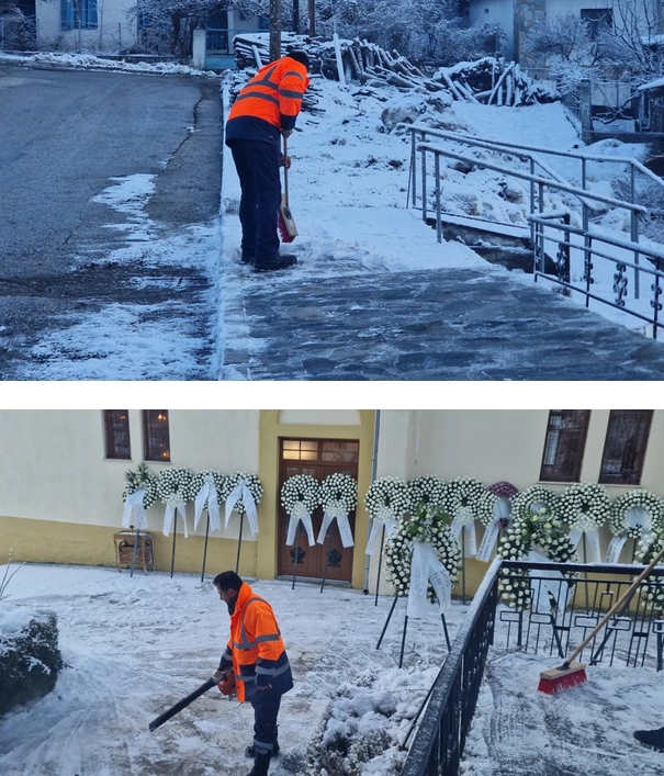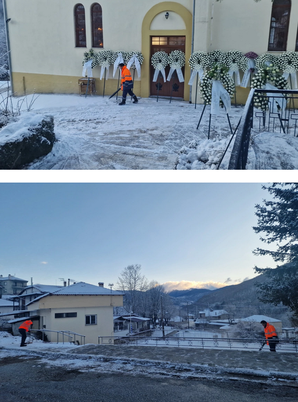 Εργαζόμενοι του Δήμου βρίσκονται από νωρίς στην εκκλησία για να καθαρίσουν το χιόνι πριν τη μεταφορά της σορού και την άφιξη του κόσμου.