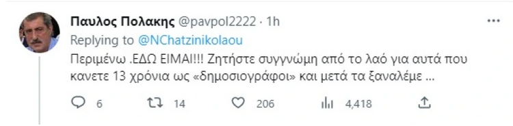 Λίγο μετά τα μεσάνυχτα, ο Πολάκης έκανε την εμφάνισή του και απάντησε στον Χατζηνικολάου, καλώντας τον να ζητήσει συγγνώμη από τον λαό. «Περιμένω. ΕΔΩ ΕΙΜΑΙ!!! Ζητήστε συγγνώμη από το λαό για αυτά που κάνετε 13 χρόνια ως «δημοσιογράφοι» και μετά τα ξαναλέμε…» έγραψε ο κ. Πολάκης.
