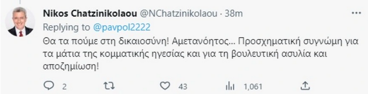Ωστόσο, ο δημοσιογράφος επανήλθε, ξεκαθαρίζοντας πως τον λόγο θα αναλάβει, πλέον, η δικαιοσύνη. «Θα τα πούμε στη δικαιοσύνη! Αμετανόητος… Προσχηματική συγνώμη για τα μάτια της κομματικής ηγεσίας και για τη βουλευτική ασυλία και αποζημίωση!» σημείωσε ο κ. Χατζηνικολάου.
