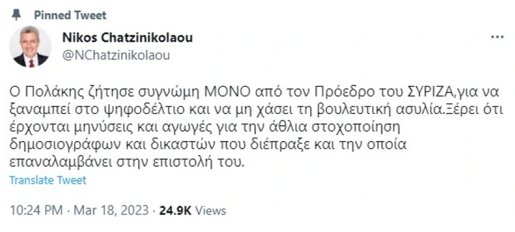 Λίγες ώρες μετά την επιστροφή του στα ψηφοδέλτια του ΣΥΡΙΖΑ, ο Παύλος Πολάκης ξαναπήρε στα χέρια του το πληκτρολόγιο και απάντησε στον Νίκο Χατζηνικολάου, ο οποίος είχε κάνει νωρίτερα ανάρτηση, λέγοντας ότι «ο Πολάκης ζήτησε συγνώμη.... για να ξαναμπεί στο ψηφοδέλτιο και να μη χάσει τη βουλευτική ασυλία».