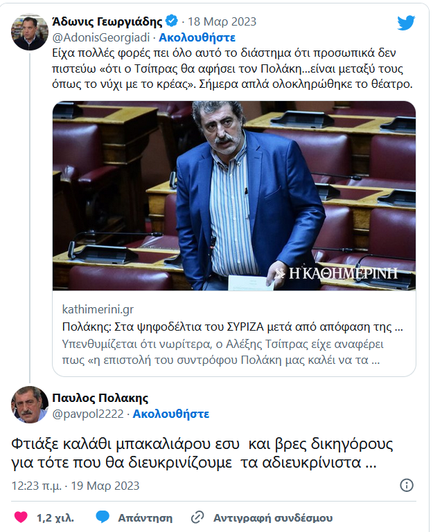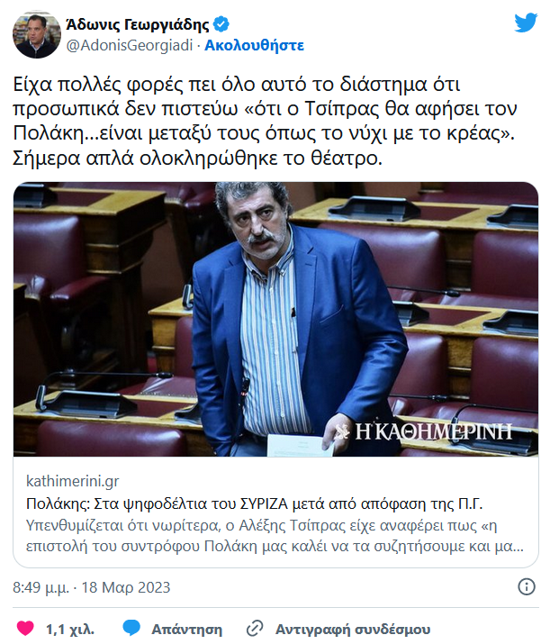 Συγκεκριμένα, ο κ. Γεωργιάδης είχε γράψει: «Είχα πολλές φορές πει όλο αυτό το διάστημα ότι προσωπικά δεν πιστεύω «ότι ο Τσίπρας θα αφήσει τον Πολάκη… είναι μεταξύ τους όπως το νύχι με το κρέας». Σήμερα απλά ολοκληρώθηκε το θέατρο».