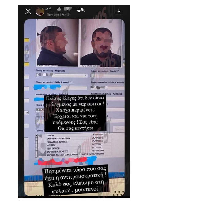 Τελικά, σύμφωνα με την καταγγελία που έκανε, «ο εγκαλούμενος στις 11-02-2023 ανέβασε στο λογαριασμό που διατηρεί του προσωπικό του προφίλ στο μέσο κοινωνικής δικτύωσης “Instagram” με το όνομα «…», μία δημοσίευση σε φωτογραφία που ανέφερε το ποινικό μου μητρώο και που με απεικόνιζε σε φωτογραφίες του προσώπου μου που είχαν τραβηχτεί από την αστυνομία λόγω προσαγωγής μου σε παλαιά αδικήματα. Η φωτογραφία της δημοσίευσης φαινόταν ότι προέρχονταν από την φωτογράφιση σε σελίδα/παράθυρο του υπολογιστή που έχουν πρόσβαση μόνο αστυνομικές υπηρεσίες. Επιπλέον, στην φωτογραφία που ανέβασε στο προφίλ του και την οποία σας προσκομίζω, ανέφερε επί λέξη τα εξής: “Επίσης έλεγες ότι δεν είσαι μπλεγμένος με ναρκωτικά. ΧΑΑΧΑ περιμένετε Έρχεται και για τους επόμενους! Σας είπα θα σας κεντήσω”».