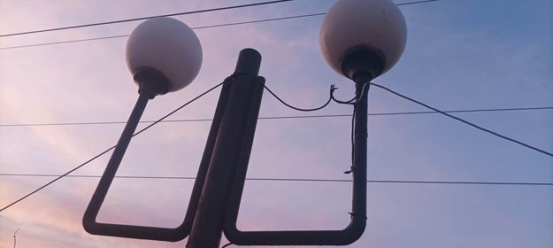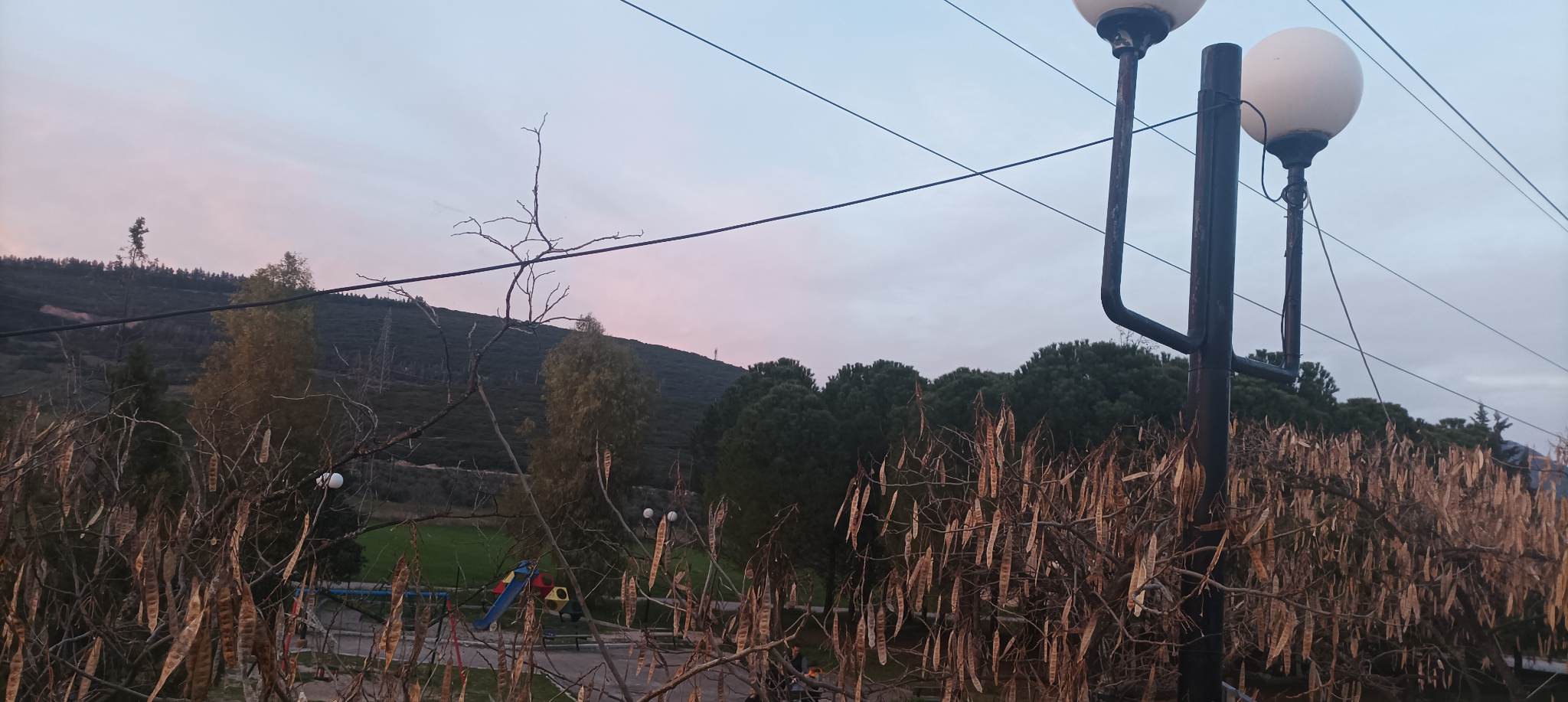 «Παιδική χαρά Ευρυτάνων... Καλώδια φωτισμού κρέμονται επάνω στα δέντρα.