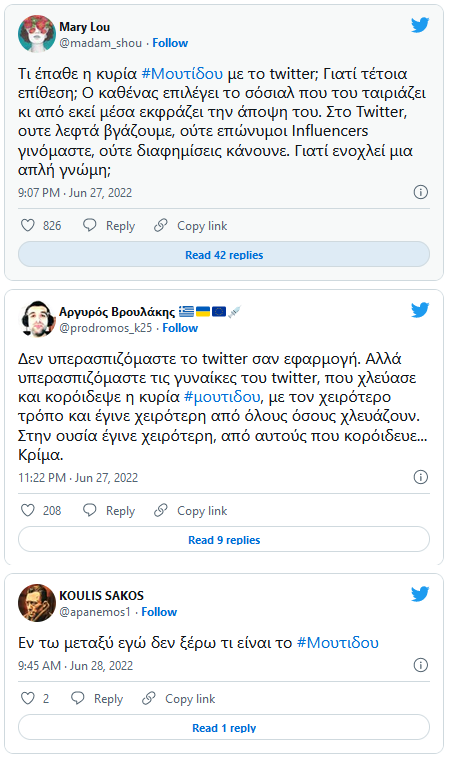 Tο άγριο κράξιμο στο Twitter και τους χρήστες του δια στόματος Σοφίας Μουτίδου ξεσήκωσε θύελλα αντιδράσεων. Να μετονομαστεί σε "Τοξίττερ" πρότεινε η ίδια. Την κατηγόρησαν για προβολή μισογυνιστικών και σεξιστικών προτύπων.