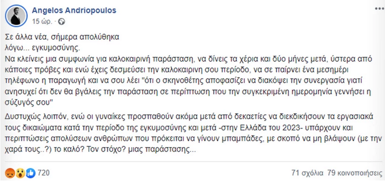 Δυστυχώς, λοιπόν, ενώ οι γυναίκες προσπαθούν ακόμα μετά από δεκαετίες να διεκδικήσουν τα εργασιακά τους δικαιώματα κατά την περίοδο της εγκυμοσύνης και μετά, στην Ελλάδα του 2023 υπάρχουν και περιπτώσεις απολύσεων ανθρώπων που πρόκειται να γίνουν μπαμπάδες, με σκοπό να μη βλάψουν (με τη χαρά τους..?) το καλό; Τον στόχο; μιας παράστασης…».