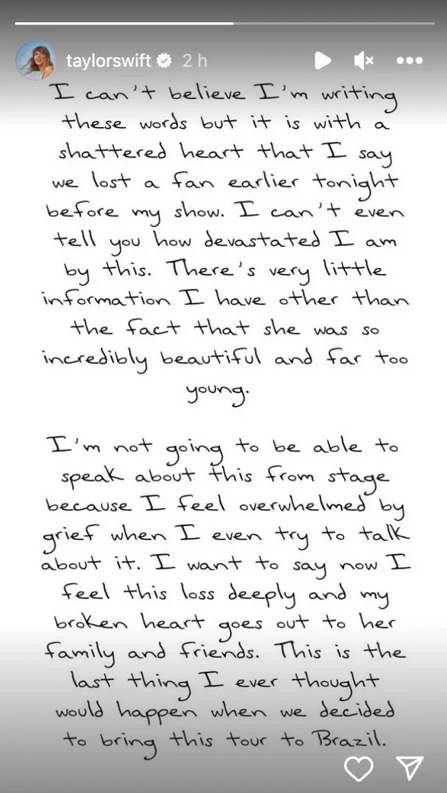 Τελικά, λίγες ώρες μετά, αποκαλύφθηκε ότι η 23χρονη Ana Benevides πέθανε κατά τη διάρκεια της συναυλίας της Taylor Swift αφού λιποθύμησε λόγω της υπερβολικής ζέστης μέσα στο στάδιο. Σύμφωνα με τοπικά ΜΜΕ, η θερμοκρασία έφτασε μέχρι και τους 37 βαθμούς.