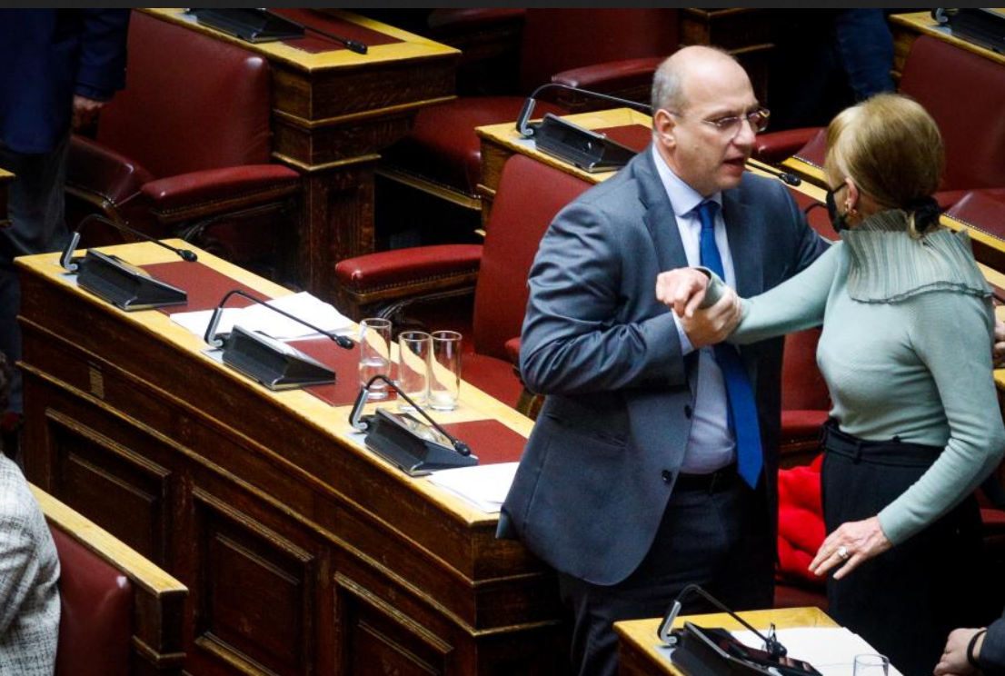 Η φωτογραφία που έχει γίνει viral στο διαδίκτυο δείχνει τον κυβερνητικό εκπρόσωπο Γιάννη Οικονόμου να σπεύδει να συγκρατήσει τη Φωτεινή Πιπιλή, πιάνοντάς την αγκαζέ και αναγκάζοντας την να επιστρέψει στην θέση της.