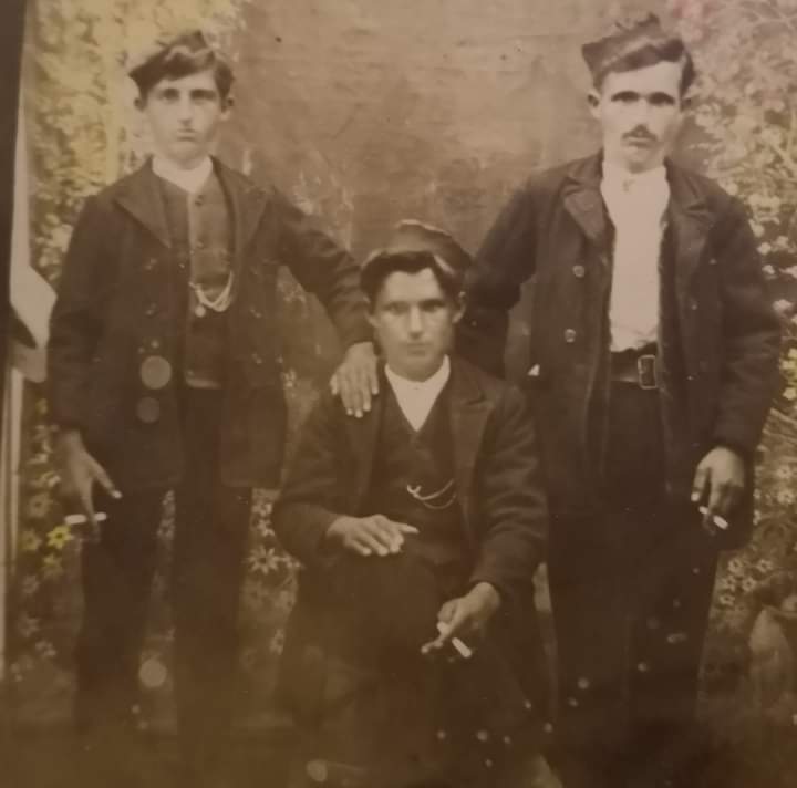 Στη φωτογραφία που έχει τραβηχτεί την ημέρα της εορτής του Αγίου Κωνσταντίνου βλέπουμε, από αριστερά προς τα δεξιά, τονΠαναγιώτη Τσαμαδιά, πατέρα του Ντίνου Τσαμαδιά και παππού του ΥπουργούΧρήστου Σταϊκούρακαι δίπλα τονΙωάννη Σαρακιώτηπαππού του Βουλευτή του ΣΥΡΙΖΑΓιάννη Σαρακιώτη, ενώ για τον τρίτο φίλο της παρέας, τον Αθανάσιο Γαλάνη, δεν έχουμε άλλες πληροφορίες.