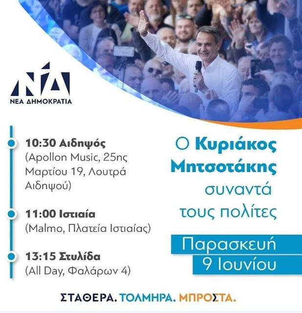 Στην έδρα του Δήμου της Ανατολικής Φθιώτιδας ο αρχηγός της Νέας Δημοκρατίας θα βρίσκεται στις 13:15’ στο All Day, Φαλάρων 4, στην πλατεία Στυλίδας.
