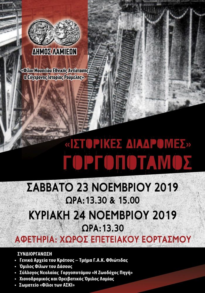 Ο Δήμος Λαμιέων, οι «Φίλοι Μουσείου Εθνικής Αντίστασης και Σύγχρονης Ιστορίας Ρούμελης», τα Γενικά Αρχεία του Κράτους - Τμήμα Φθιώτιδας, ο Όμιλος Φίλων του Δάσους, ο Σύλλογος Νεολαίας Γοργοποτάμου «Η Ζωοδόχος Πηγή» και οι «Φίλοι των Α.Σ.Κ.Ι» πραγματοποιούν για δεύτερη συνεχόμενη χρονιά την «Ιστορική Διαδρομή Γοργοποτάμου» το Σάββατο 23 Νοεμβρίου 2019, ώρες 13:30 και 15:00 και την Κυριακή 24 Νοεμβρίου 2019, ώρα 13:30 με αφετηρία το χώρο του επετειακού εορτασμού.
