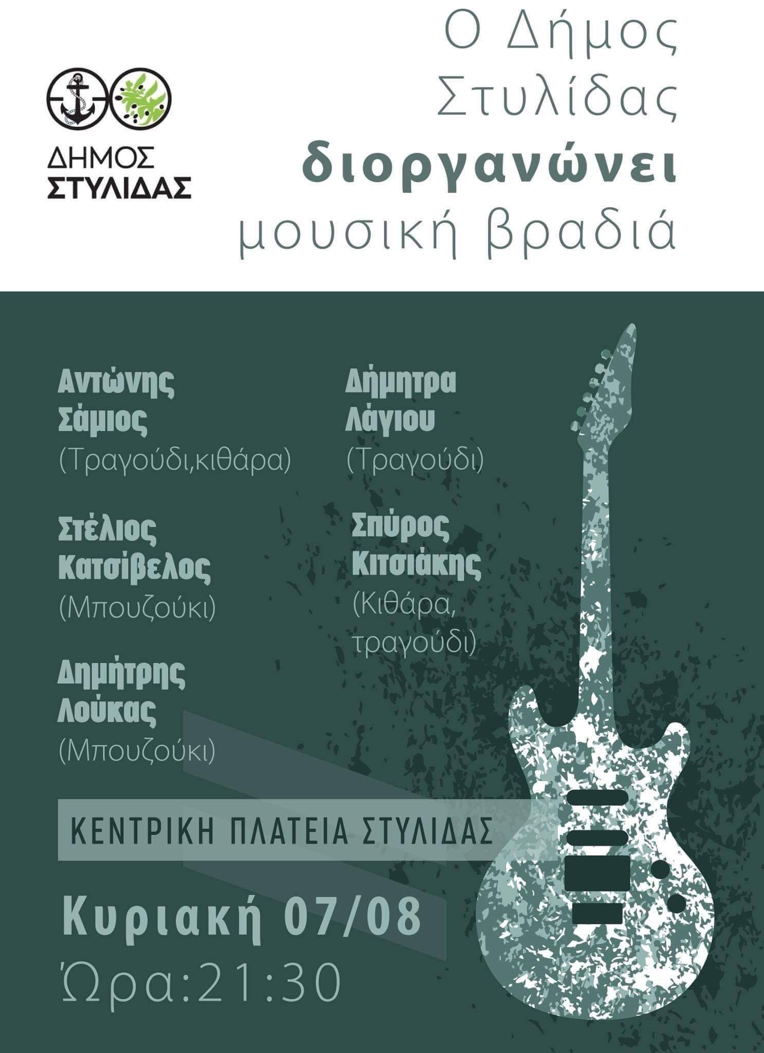 Μουσική βραδιά με αγαπημένα ελληνικά τραγούδια διοργανώνει ο Δήμος Στυλίδας την Κυριακή, 7 Αυγούστου, στην Κεντρική Πλατεία Στυλίδας, με τη συμμετοχή αξιόλογων καλλιτεχνών.