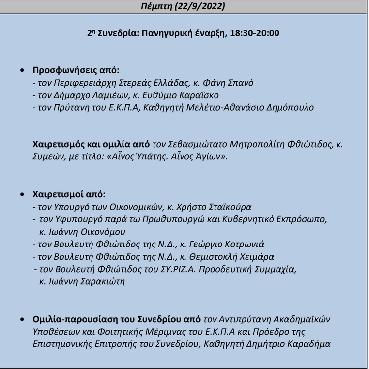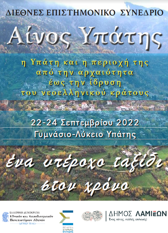 Η Περιφέρεια Στερεάς Ελλάδας, ο Δήμος Λαμιέων, το Εθνικό και Καποδιστριακό Πανεπιστήμιο Αθηνών, με την υποστήριξη του Οργανισμού Πολιτιστικής Ανάπτυξης Στερεάς Ελλάδας (ΟΠΑΣΤΕ) συνδιοργανώνουν στην Υπάτη, από τις 22 έως και τις 24 Σεπτεμβρίου 2022, τριήμερο Διεθνές Επιστημονικό Συνέδριο για την ιστορική πόλη με τίτλο «Αίνος Υπάτης: η Υπάτη και η περιοχή της από την αρχαιότητα έως την ίδρυση του νεοελληνικού κράτους».