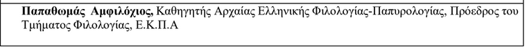 • Αμφιλόχιος Παπαθωμάς, Καθηγητής Αρχαίας Ελληνικής Φιλολογίας-Παπυρολογίας, Πρόεδρος του Τμήματος Φιλολογίας, ΕΚΠΑ