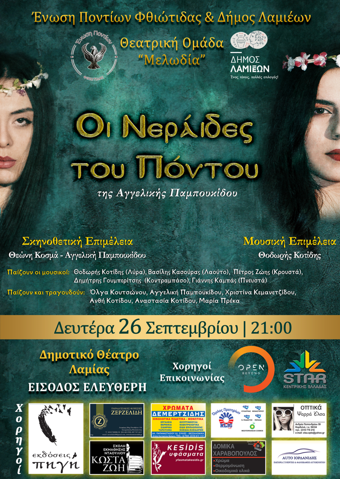 Η Ένωση Ποντίων Φθιώτιδας σας προσκαλεί στη μουσικοθεατρική παράσταση "οι Νεράιδες του Πόντου", τη Δευτέρα, 26 Σεπτεμβρίου και ώρα 09:00 μ.μ., στο Δημοτικό θέατρο Λαμίας.