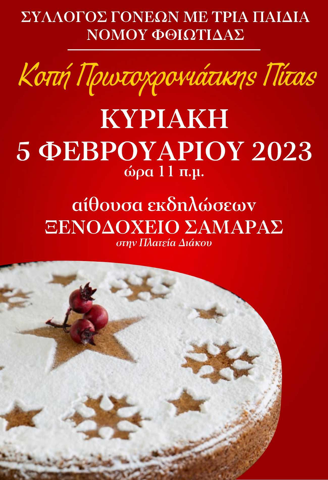 Με χαρά ανακοινώνουμε ότι την Κυριακή 5 Φεβρουαρίου 2023 και ώρα 11π.μ., θα λάβει χώρα η κοπή της Πρωτοχρονιάτικης πίτας του Συλλόγου μας, στο Ξενοδοχείο "Σαμαράς" στην Πλατεία Διάκου. Θα πραγματοποιηθεί λαχειοφόρος αγορά και θα κληρωθούν σημαντικά δώρα.