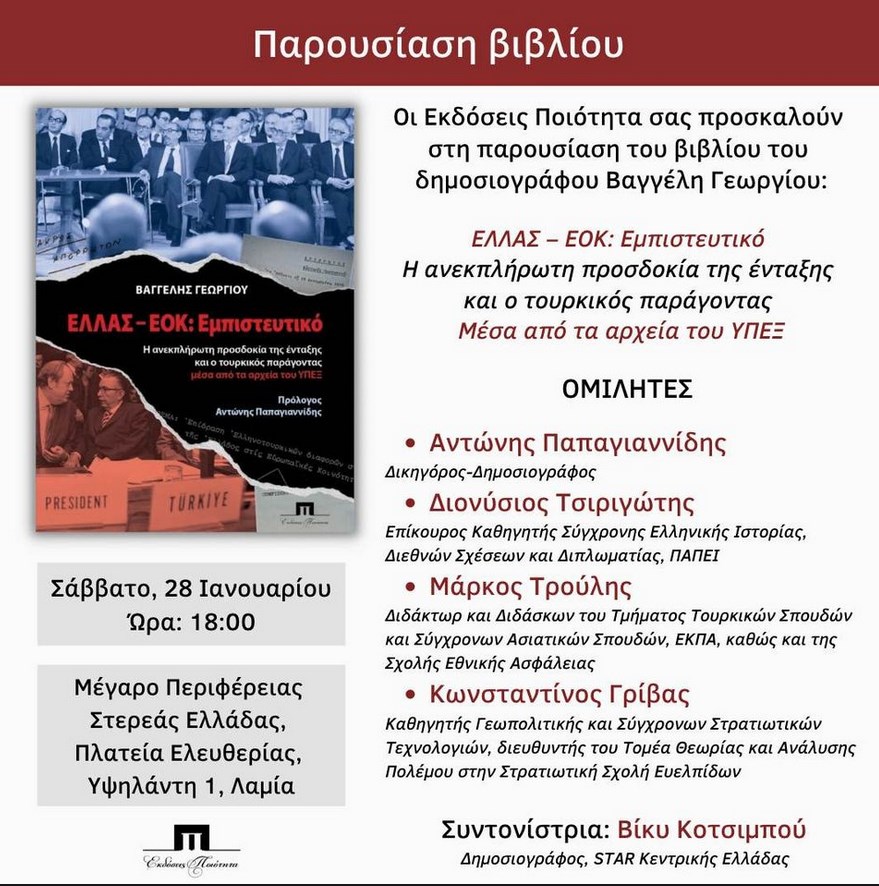 Το βιβλίο του με τίτλο: «Ελλάς-ΕΟΚ: Εμπιστευτικό» Η ανεκπλήρωτη προσδοκία της ένταξης και το τουρκικός παράγοντας μέσα από τα αρχεία του ΥΠΕΞ, από τις εκδόσεις Ποιότητα, παρουσιάζει στη Λαμία ο δημοσιογράφος Βαγγέλης Γεωργίου.