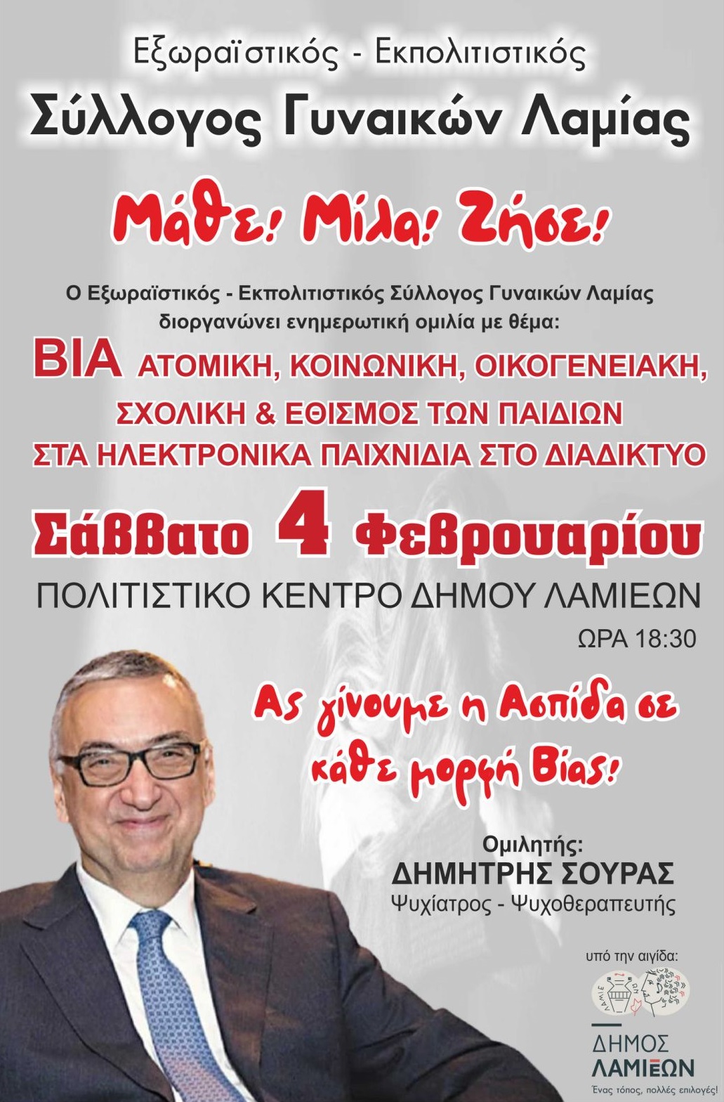 Ο Εξωραϊστικός και Εκπολιτιστικός σύλλογος Γυναικών Λαμίας σας προσκαλεί στην ενημερωτική ομιλία με θέμα τη βία κι όπως αυτή εκδηλώνεται σε κάθε μορφή της, το Σάββατο 4 Φεβρουαρίου 2023 και ώρα 18.30, στο Πολιτιστικό κέντρο του Δήμου Λαμιέων, με ομιλητή το γνωστό ψυχίατρο και ψυχοθεραπευτήΔημήτρη Σούρα.