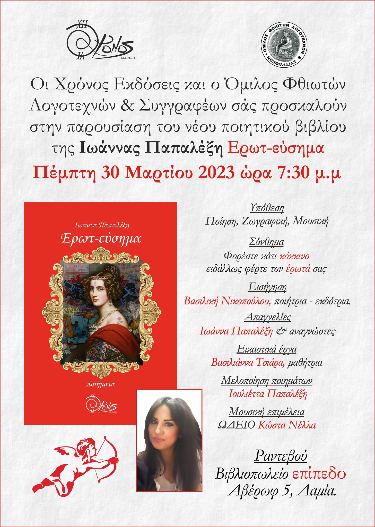 Ο Όμιλος Φθιωτών Λογοτεχνών και Συγγραφέων και οι Χρόνος Εκδόσεις, σας προσκαλούν στην παρουσίαση της νέας ποιητικής συλλογής «Ερωτ-εύσημα» της Ιωάννας Παπαλέξη, την Πέμπτη, 30 Μαρτίου 2023 και ώρα 7.30 μ.μ. , στο Βιβλιοπωλείο Επίπεδο (Αβέρωφ 5 - Λαμία).
