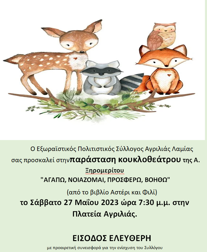 O Εξωραϊστικός Πολιτιστικός Σύλλογος Αγριλιάς Λαμίας, σας προσκαλεί στηνπαράσταση κουκλοθεάτρουτης Α. Ξηρομερίτου "Αγαπώ, Νοιάζομαι, Προσφέρω, Βοηθώ" (από το βιβλίο Αστέρι και Φιλί), το Σάββατο 27 Μαΐου 2023 ώρα 7:30 μ.μ. στην Πλατεία Αγριλιάς.