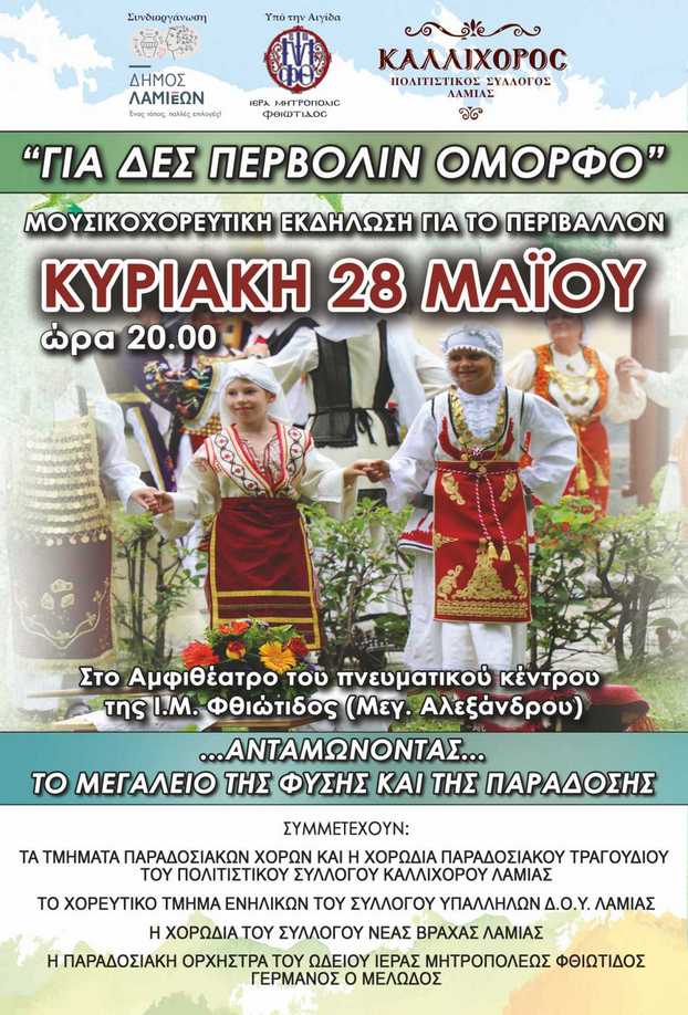 Ο Πολιτιστικός Σύλλογος Καλλίχορος Λαμίας σας καλεί στη μουσικοχορευτική εκδήλωση που διοργανώνει την Κυριακή 28 Μαΐου στις 20:00 στο αμφιθέατρο του Πνευματικού και Διοικητικού Κέντρου της Ιεράς Μητρόπολης Φθιώτιδας, στην οδό Μεγάλου Αλεξάνδρου.