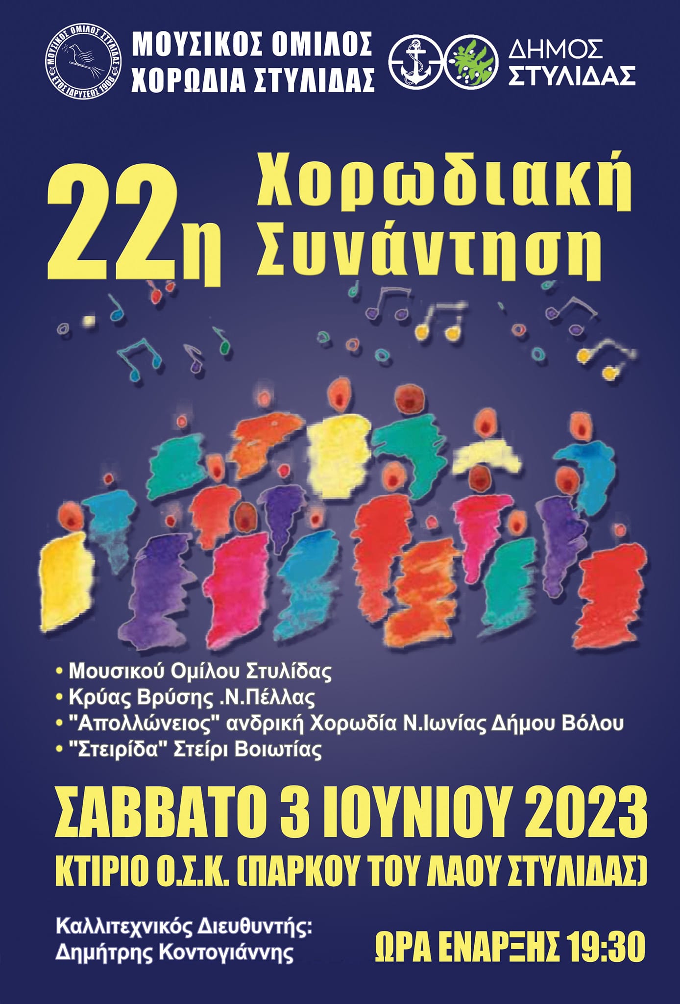 Σας περιμένουμε στην 22η χορωδιακή μας συνάντηση το Σάββατο 3 ΙΟΥΝΙΟΥ στις 7.30 το απόγευμα , που θα γίνει στο κτίριο Ο Σ.Κ.στην Στυλίδα, να γιορτάσουμε την χαρά της μουσικής,να απολαύσουμε ιδιαίτερες επεξεργασίες και μοναδικές ερμηνείες.