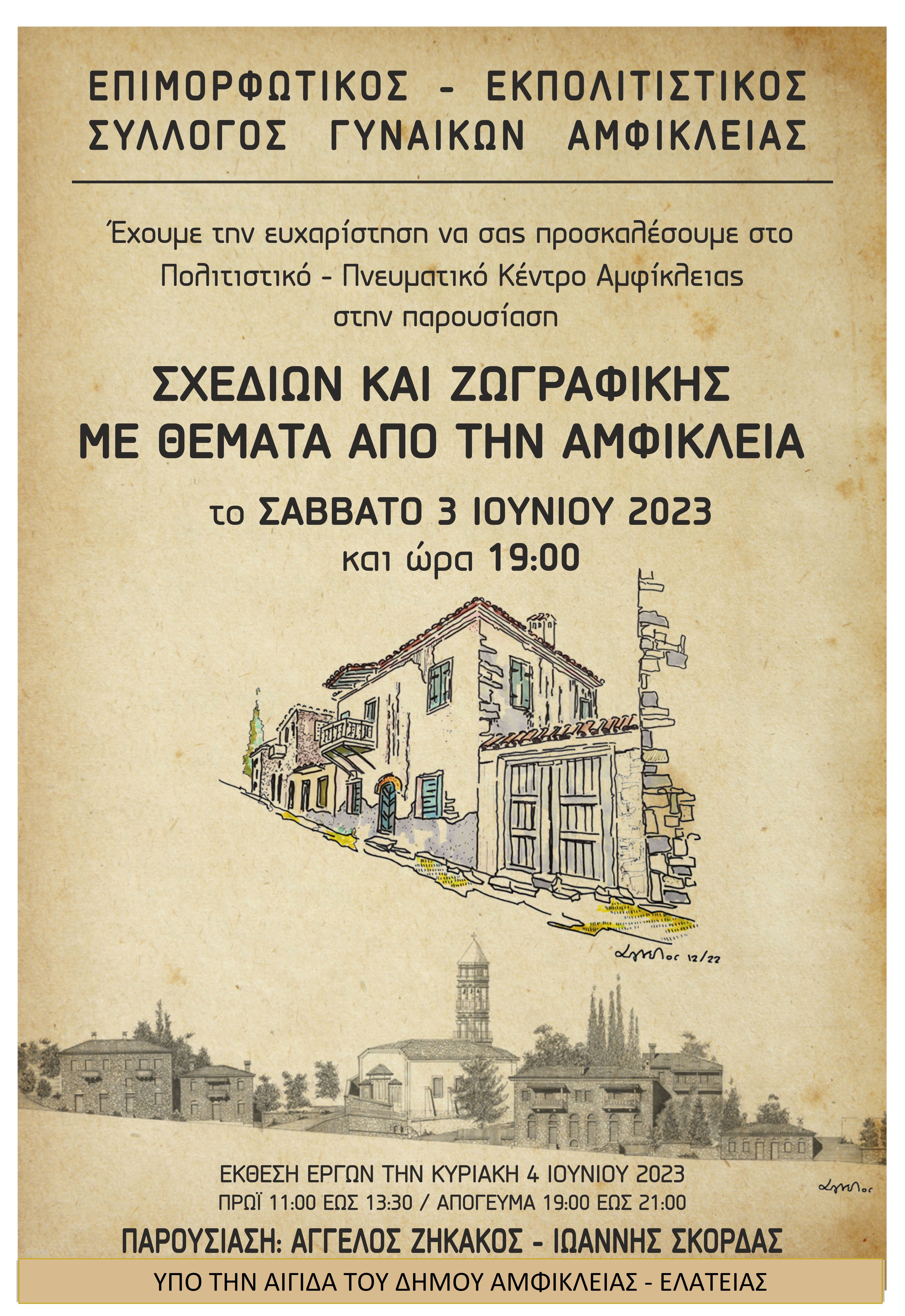 Ο Επιμορφωτικός - Εκπολιστιστικός Σύλλογος Γυναικών Αμφίκλειας, σας προσκαλούν στα εγκαίνια της έκθεσης και στην παρουσίαση των έργων με θέματα από την Αμφίκλεια του Άγγελου Ζηκάκου, που θα πραγματοποιηθεί το Σάββατο 3 Ιουνίου 2023 και ώρα 19:00 στο Παπακώστειο Πνευματικό Κέντρο Αμφίκλειας, υπό την αιγίδα του Δήμου Αμφίλειας - Ελάτειας.