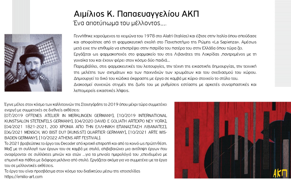 Ο εμπνευσμένος εικαστικός δημιουργός Αιμίλιος Κ .Παπαευαγγελίου ΑΚΠ παρουσιάζει την ατομική έκθεση του με τίτλο "Γραμμές" και υπότιτλο... ένα αποτύπωμα του μέλλοντος στην αίθουσα εκδηλώσεων του Δημαρχείου Αταλάντης του Δήμου Λοκρών από τις 9 έως τις 11 Ιουνίου 2023 .Τα εγκαίνια της έκθεσης θα γίνουν στις 9 Ιουνίου στις 21.00.