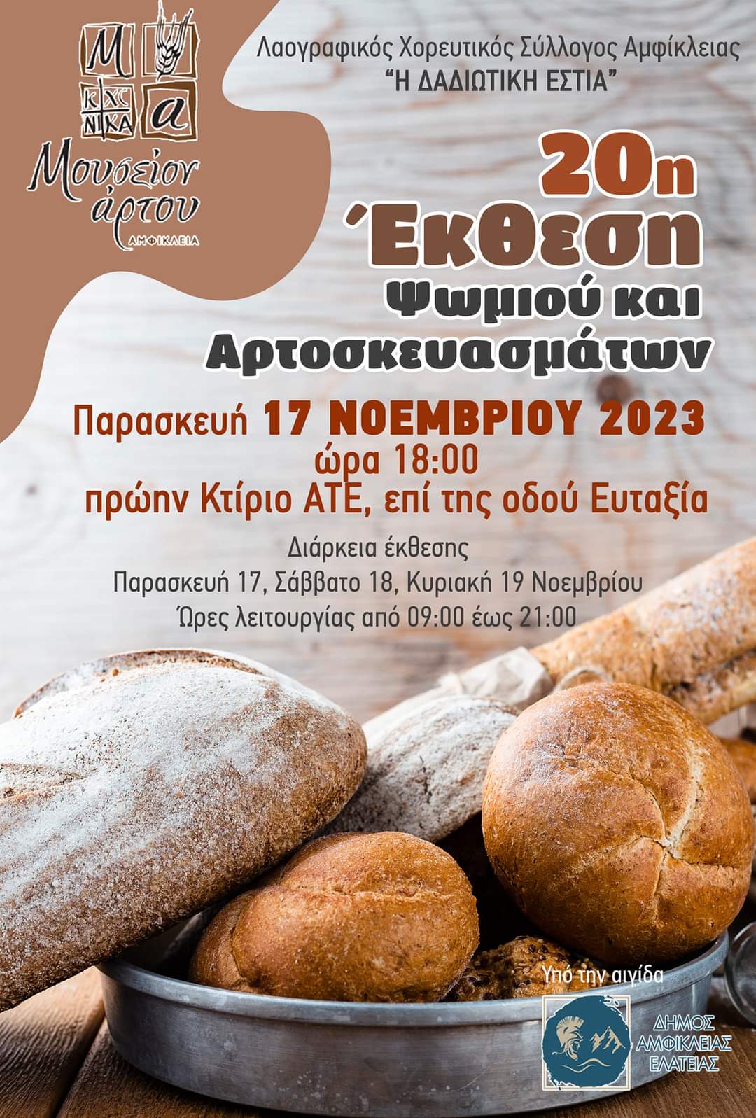 Πιστός στις παραδόσεις, τα ήθη και τα έθιμα του τόπου μας ο εμπνευστής και πρωτοπόρος Λαογραφικός - Χορευτικός Σύλλογος Αμφίκλειας "Η Δαδιώτικη Εστία" διοργανώνει και φέτος την 20η Έκθεση Ψωμιού & Αρτοσκευασμάτων, η οποία θα πραγματοποιηθεί από τις 17 έως και τις 19 Νοεμβρίου 2023 στο πρώην κτίριο ΑΤΕ, επί της οδού Ευταξία στην Αμφίκλεια.