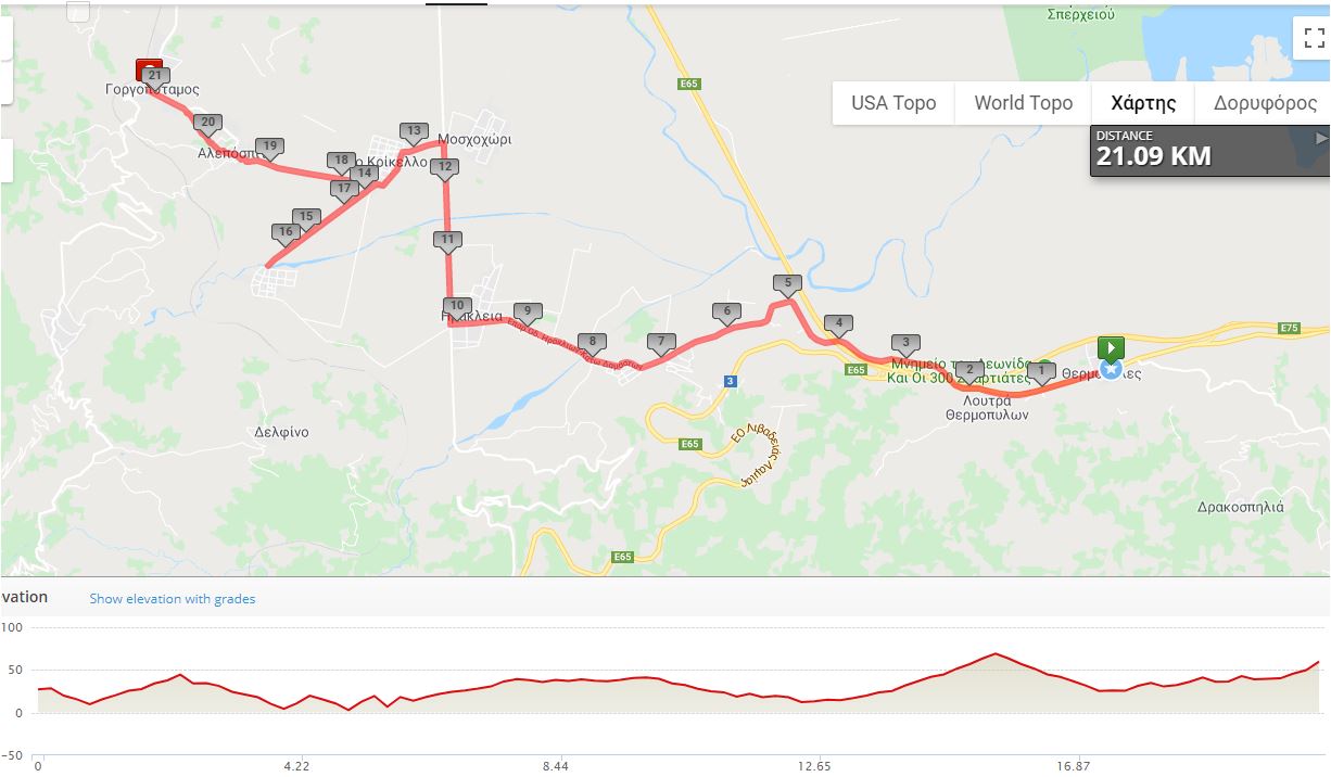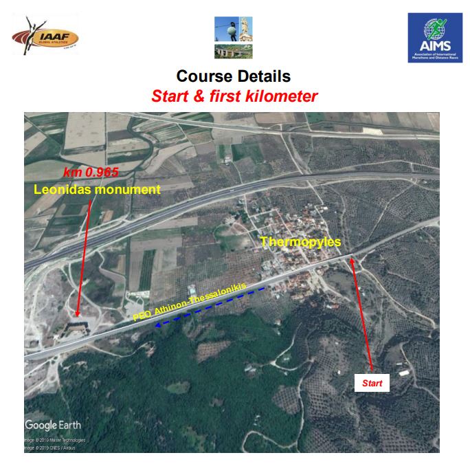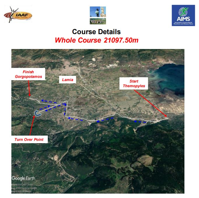 Για τον αγώνα του ημιμαραθωνίου η εκκίνηση είναι στις Θερμοπύλες πριν την είσοδο του χωριού, 550μ πριν τον ανδριάντα του ΛΕΩΝΙΔΑ στις Θερμοπύλες (198 χιλιόμετρο Αθηνών Λαμίας). Οι αθλητές –τριες θα ακολουθήσουν τη διαδρομή Θερμοπύλες – Αλαμάνα μέσω της Π.Ε.Ο Αθηνών Λαμίας και θα τερματίσουν στο Γοργοπόταμο, περνώντας τα Δημοτικά Διαμερίσματα του Δήμου Λαμίας - Δαμάστας – Ηράκλειας – Μοσχοχωρίου – Ν. Κρικέλου – Άνω Βαρδατών - Αλεποσπίτων, και τερματισμό μπρος στη εκκλησία του Γοργοποτάμου.
