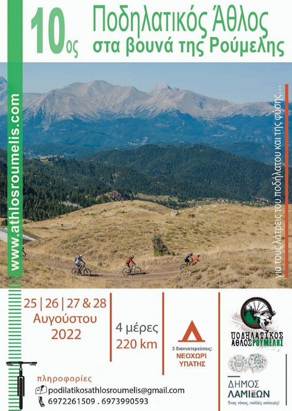 Ο Δήμος Λαμιέων συνδιοργανώνει με τον «Ποδηλατικό Άθλο Ρούμελης», τον 10ο Ποδηλατικό Άθλο στα βουνά της Ρούμελης που θα πραγματοποιηθεί από 25 έως 28 Αυγούστου, με αφετηρία και τερματισμό τα Λουτρά Υπάτης, με τρεις διανυκτερεύσεις και επίκεντροτων περισσοτέρων δράσεων και εκδηλώσεων το Νεοχώρι Υπάτης, περιλαμβάνοντας διαδρομές τεσσάρων ημερών και 220 χιλιομέτρων συνολικά, μέσα στο φυσικό κάλλος της Οίτης και των Βαρδουσίων.