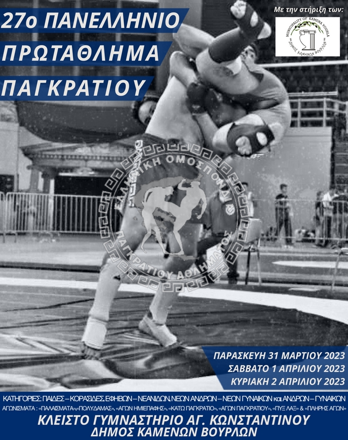 Το 27ο Πανελλήνιο Πρωτάθλημα Παγκρατίου διοργανώνει η Ελληνική Ομοσπονδία Παγκρατίου Αθλήματος, με τη στήριξη του Δήμου Καμένων Βούρλων, από την Παρασκευή 31 Μαρτίου έως την Κυριακή 2 Απριλίου 2023 στο Κλειστό Γυμναστήριο Αγίου Κωνσταντίνου!