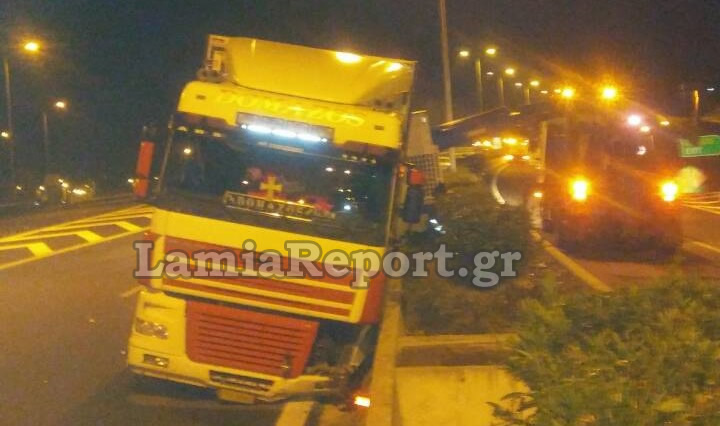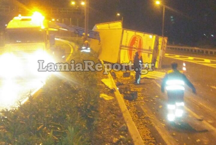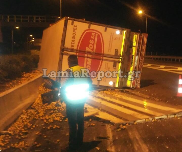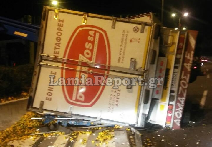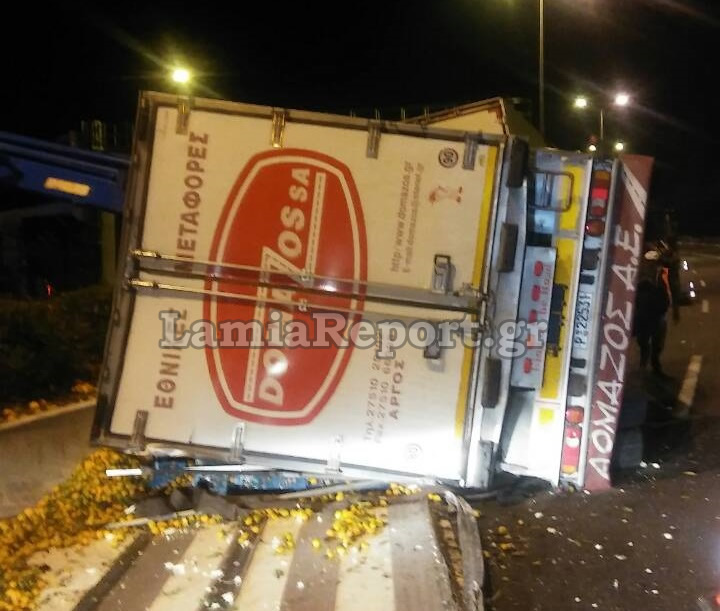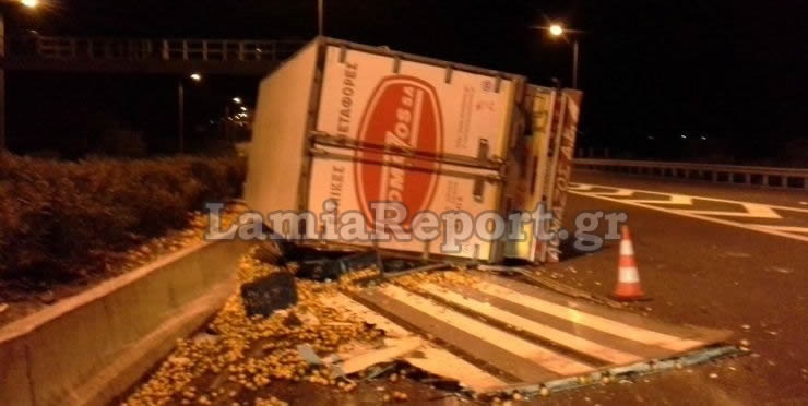 Γέμισε με μανταρίνια και πορτοκάλια η εθνική οδός, όταν γύρω στη 1:00' μετά τα μεσάνυχτα της Κυριακής, ανατράπηκε το συρόμενο μέρος νταλίκας, στο ρεύμα προς Λαμία λίγο πριν την τελευταία έξοδο των Καμένων Βούρλων.