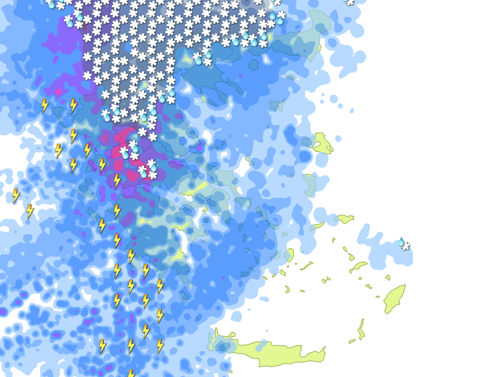 (Ακολουθεί προγνωστικός χάρτης υετού για το μεσημέρι της Τετάρτης, στον οποίο βλέπουμε ότι στο μεγαλύτερο μέρος της χώρας θα επικρατεί κακοκαιρία με αρκετά χιόνια στη ΒΔ Θεσσαλία και δυτική/κεντρική Μακεδονία).
