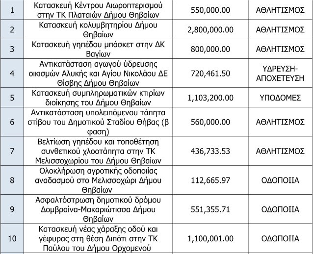 Ανάμεσα στα έργα είναι ηαποκατάσταση βλαβών της Επαρχιακής Οδού «Σκύρος – Λινάρια» μετά τα έντονα καιρικά φαινόμενα της 6-2-2019 που έπληξαν το Δήμο Σκύρου, η αναβάθμιση του προβλήτα στο λιμάνι της Ιτέας, η κατασκευή κολυμβητηρίου στο Δήμο Θηβαίων,η αποκατάσταση και ανάδειξη του Ασκληπιείου Δαφνούντoς στον Άγιο Κωνσταντίνο, κ.α.