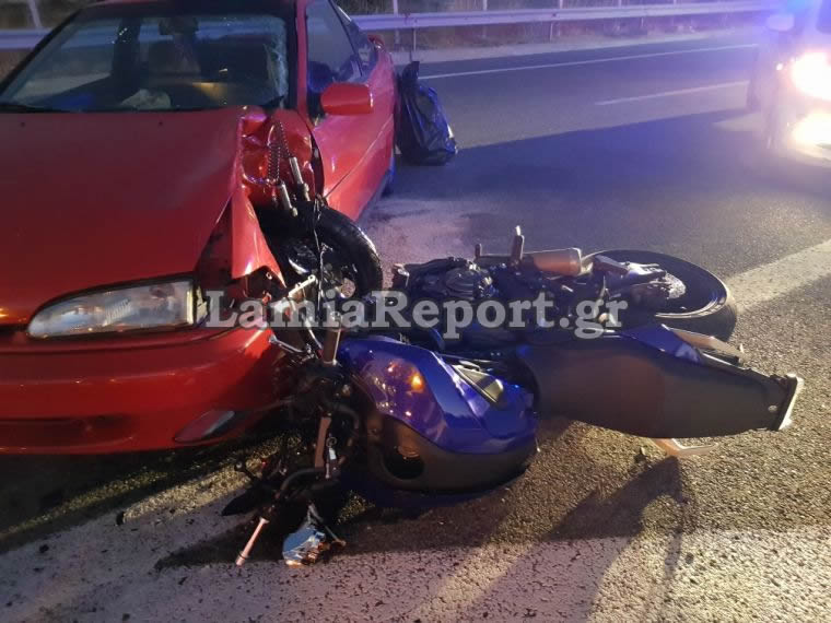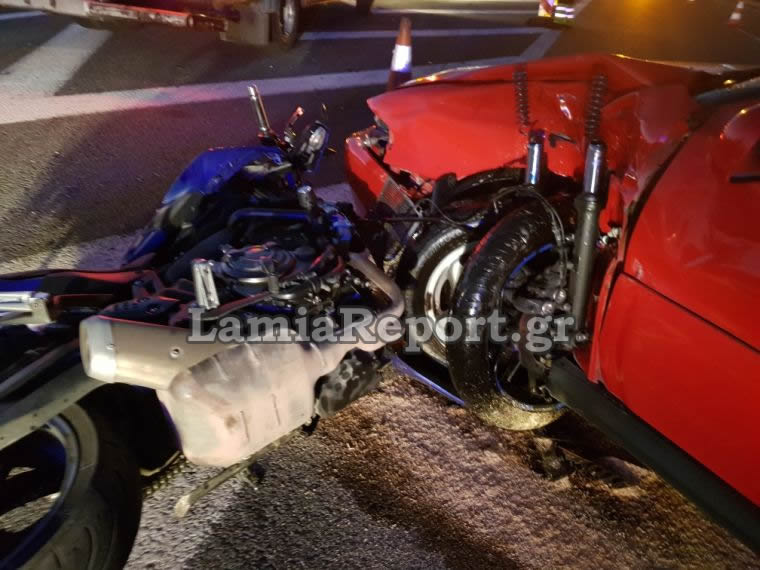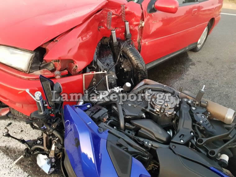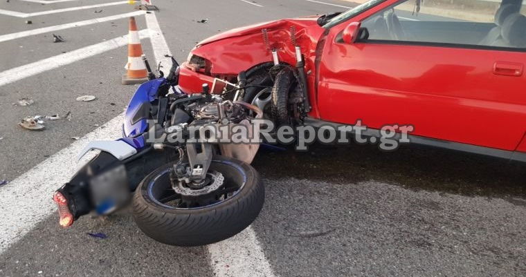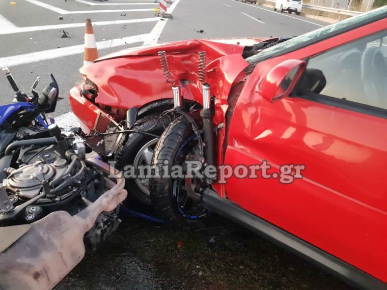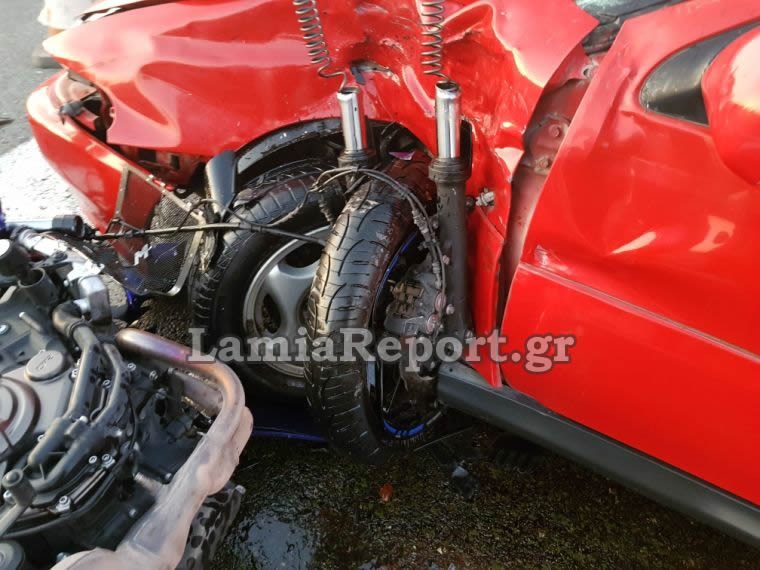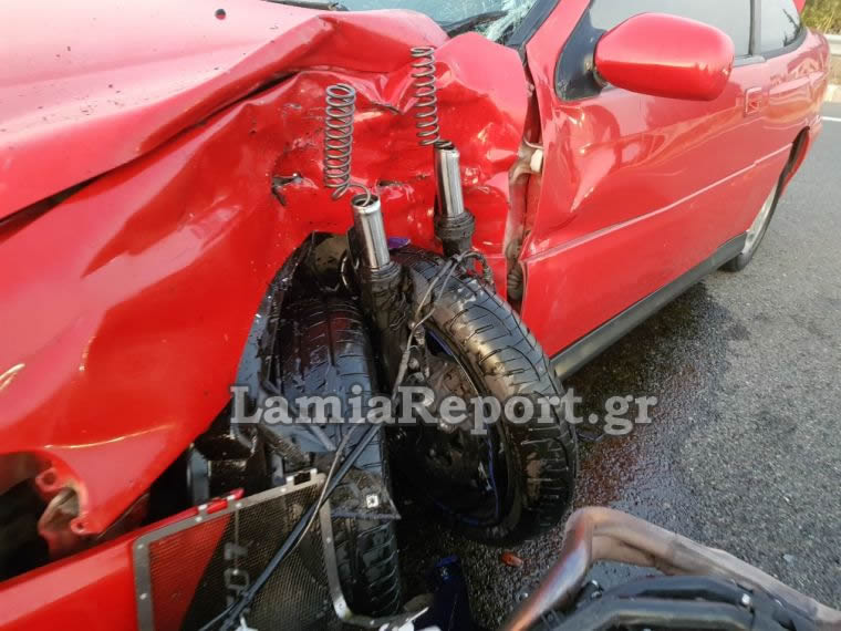 Η σύγκρουση ήταν σφοδρή και η μηχανή καρφώθηκε κυριολεκτικά στο φτερό του αυτοκινήτου, ενώ ο οδηγός "πέταξε" και προσγειώθηκε πολλά μέτρα μακριά μέσα στο οδόστρωμα.