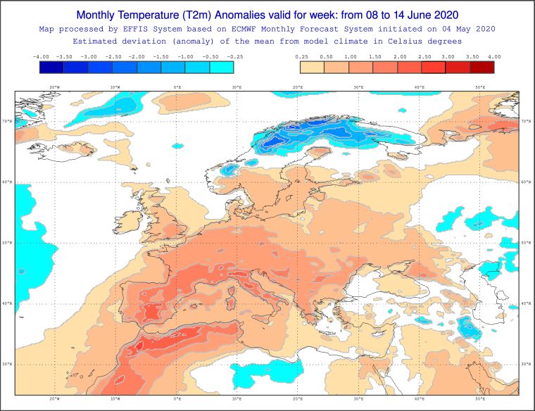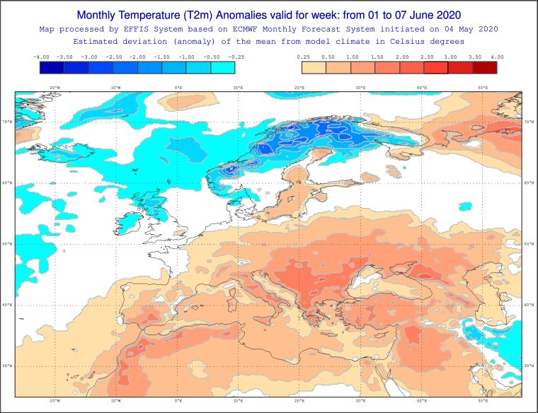 Στο σημείο αυτό να επισημάνουμε, οτι σύμφωνα με τα τελευταία κλιματικά προγνωστικά δεδομένα του Ευρωπαϊκού Κέντρου Μεσοπρόθεσμων Προγνώσεων τα οποία διατίθεται στα πλαίσια του προγράμματος EFFIS μέσω των υπηρεσιών Copernicus της Ευρωπαϊκής Ένωσης, παρατηρούμε στα συνημμένα γραφήματα οτι στο πρώτο μισό του Ιουνίου προβλέπονται υψηλές για την εποχή θερμοκρασίες στις Μεσογειακές χώρες, τα Βαλκάνια και τη χώρα μας με έμφαση στα δυτικά και βόρεια τμήματα. Πιο δροσερός θα είναι ο καιρός στην ανατολική και νότια χώρα Ελλάδα λόγω των μελτεμιών.