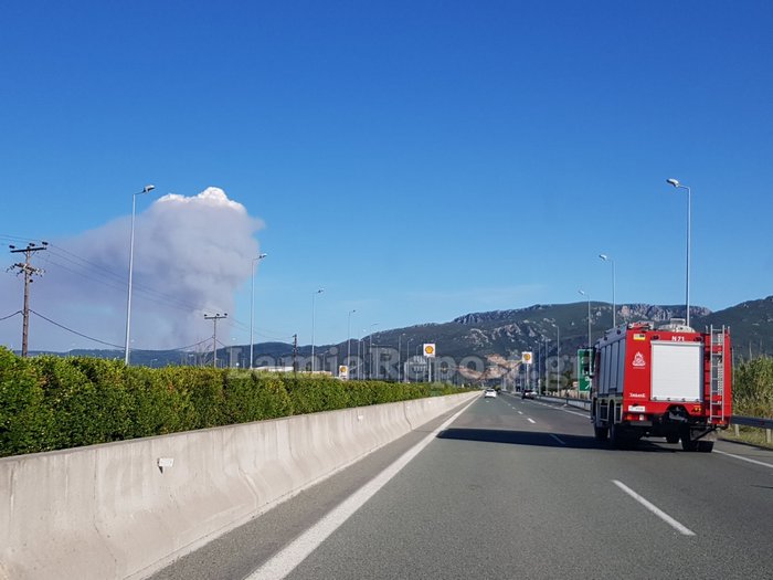 Η πυρκαγιά φαίνεται να ξεκίνησε δίπλα από την εθνική οδό και έχει πάρει διαστάσεις μέχρι τις ανεμογεννήτριες.