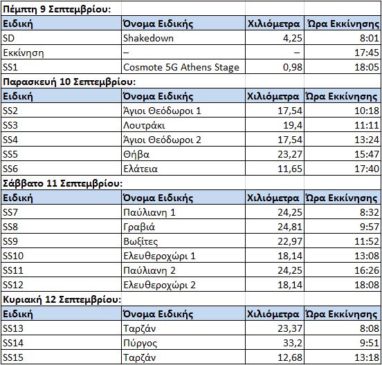 Οι αγωνιζόμενοι από την Παρασκευή έως και την Κυριακή θα κάνουν 15 ειδικές διαδρομές συνολικού μήκους 302,62 χλμ. Θα υπάρχει βέβαια την προηγούμενη ημέρα (Πέμπτη) και το ένα χιλιόμετρο που θα γίνει στο Σύνταγμα και θα χρονομετρηθεί κανονικά.