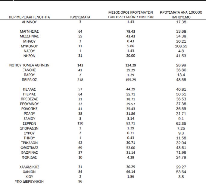 Μικρή αύξηση των κρουσμάτων στη Στερεά Ελλάδα, με 232 κρούσματα, εξαιτίας της αύξησης που παρατηρείται σε Φθιώτιδα και Φωκίδα. Η Φθιώτιδα ανέβηκε στα 69, ενώ η Φωκίδα μετά από 16 «καλές μέρες» επέστρεψε σε διψήφιο αριθμό, 10. Η Φθιώτιδα πάντως κρατάει την πρώτη θέση σε αριθμό κρουσμάτων μέσα στο μήνα (1.278), με την Εύβοια να ανεβαίνει ταχύτατα με 86 στην τελευταία έκθεση (1.261 μέχρι στιγμής). Η Βοιωτία ακολουθεί με 59 και η Ευρυτανία με 8, που είναι οι ΠΕ που παρουσιάζουν αναλογικά με τον πληθυσμό τους τα περισσότερα κρούσματα!